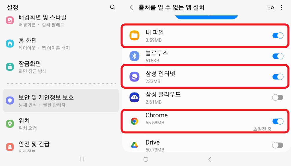 설치하려는 안드로이드 기기의 보안 및 개인정보 보호에서 출처를 알 수 없는 앱 설치를 허용해 주세요.